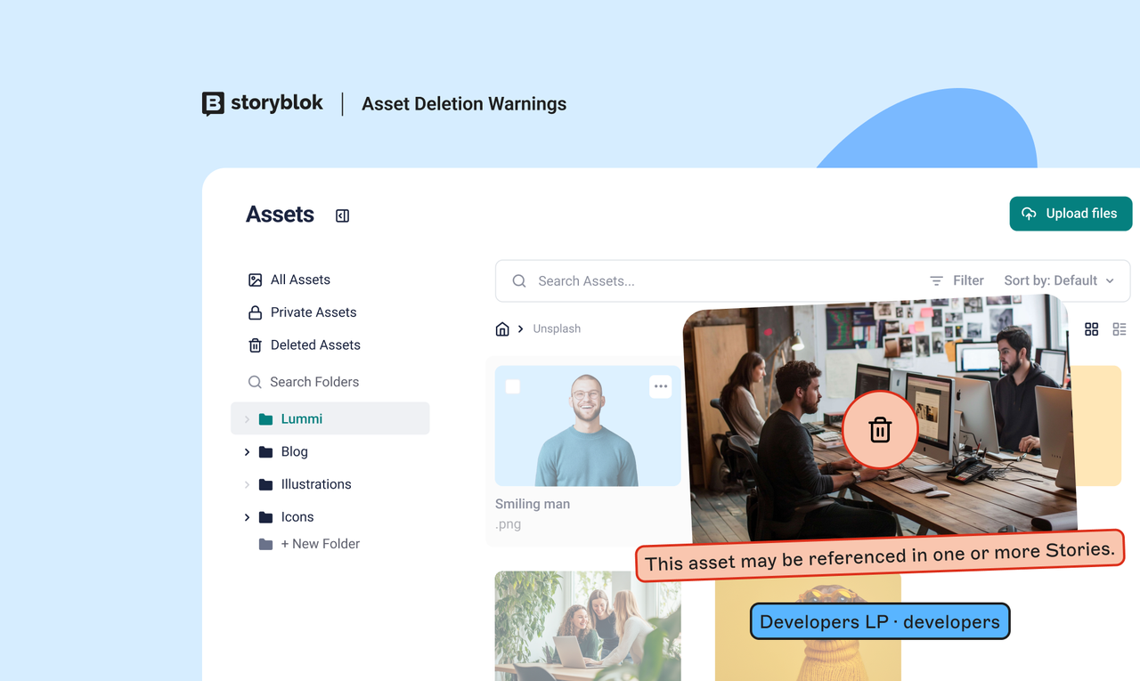 Prevents the deletion of assets referenced in stories and warns the user before the action.