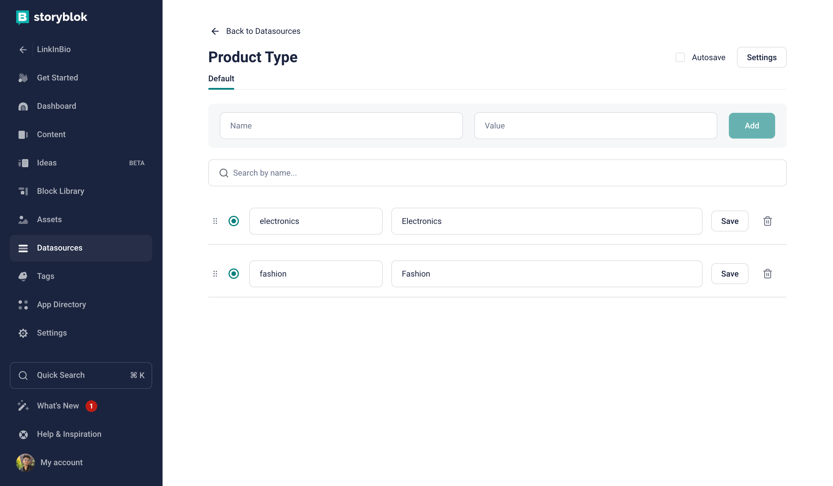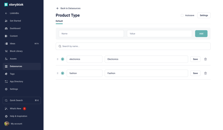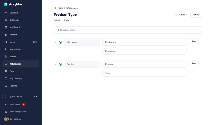Section titled “Datasource dimensions”A datasource dimension in Storyblok allows you to store multiple values under a specific key.