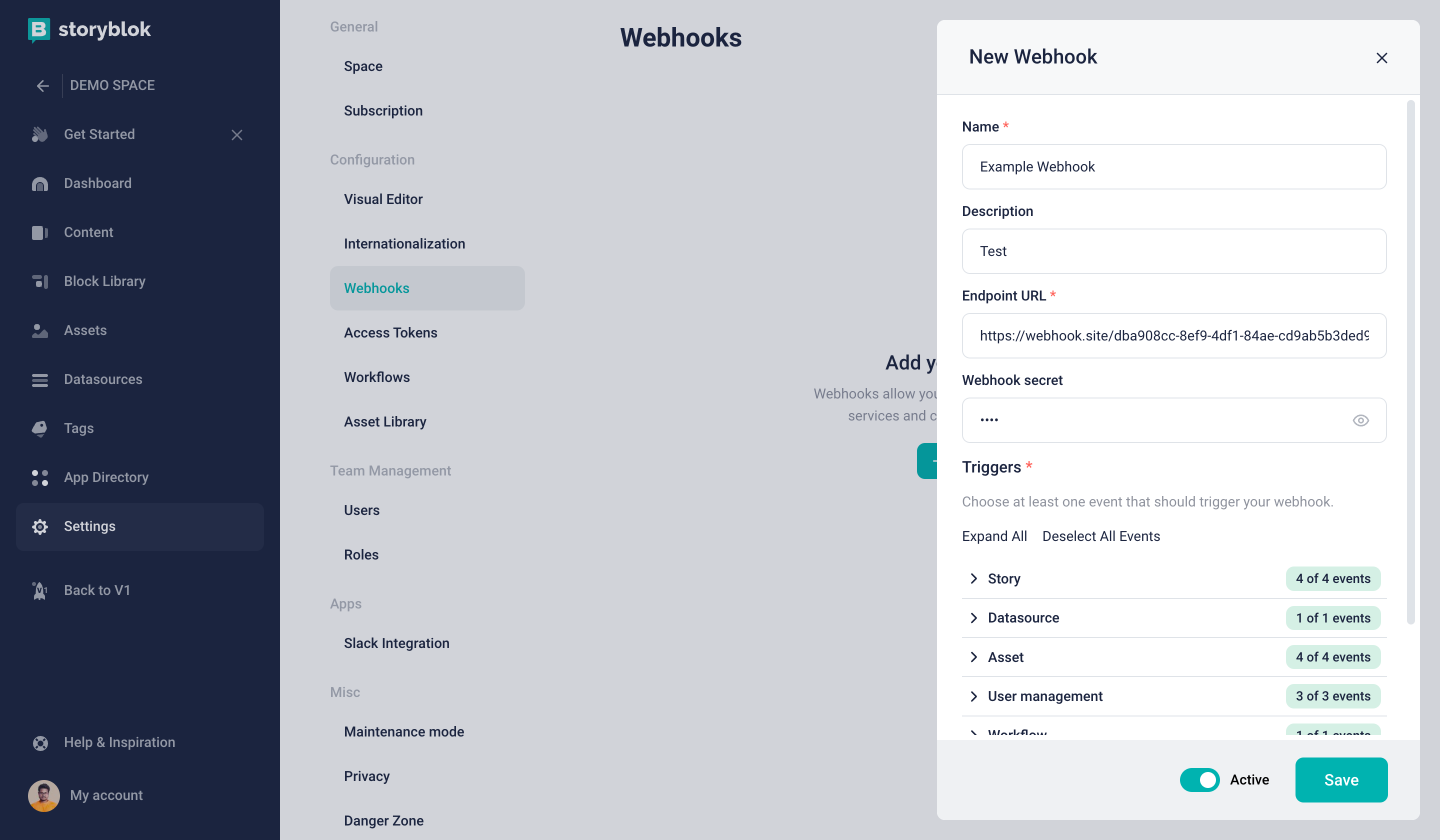 - In your space, go to Settings > Webhooks and click Add new Webhook.