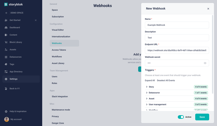 To configure a webhook in Storyblok: