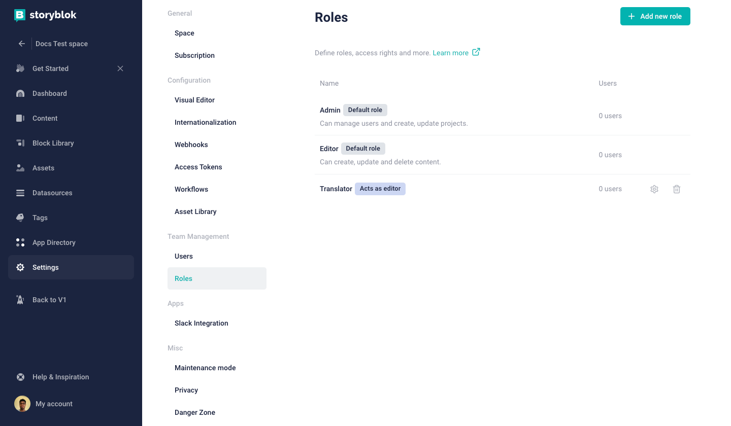 Roles let space owners and admins control access to resources and actions. Storyblok offers two types of roles: