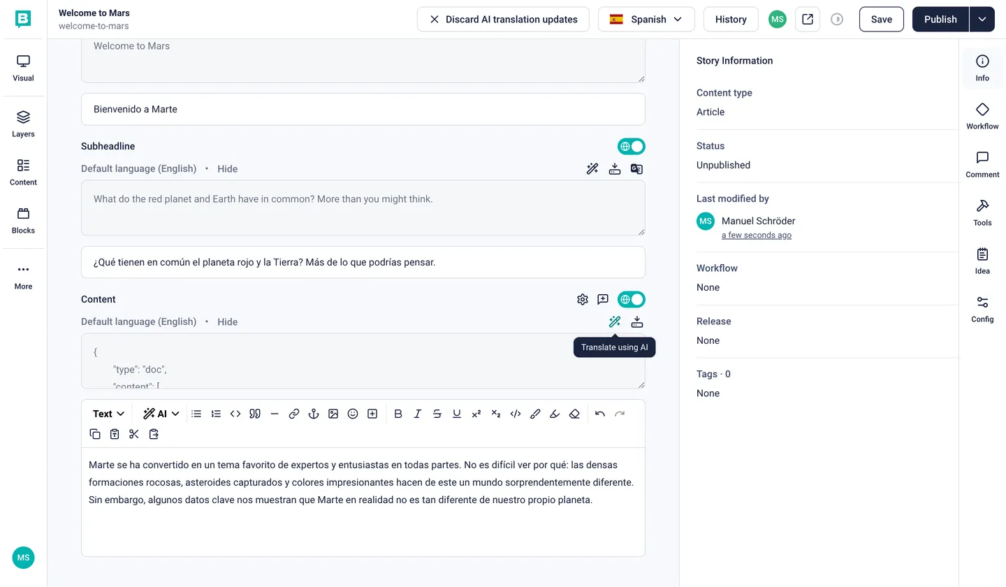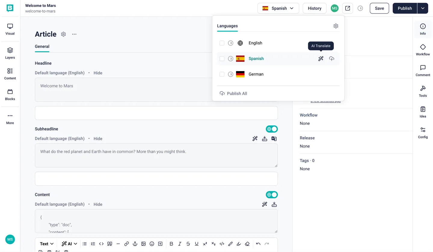 Section titled “AI Translations”AI Translations generates professional-level translations of content in multiple languages.