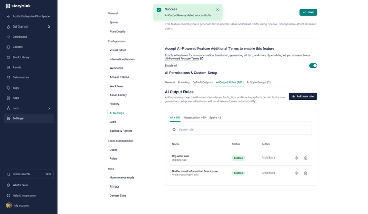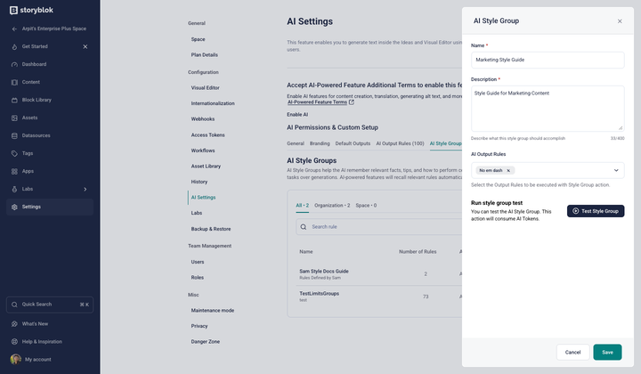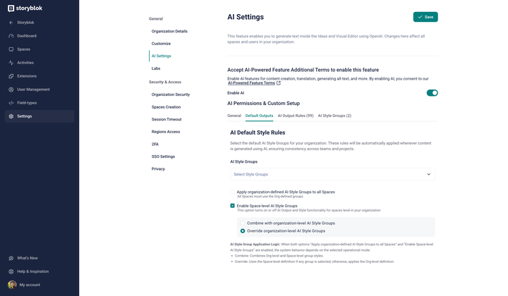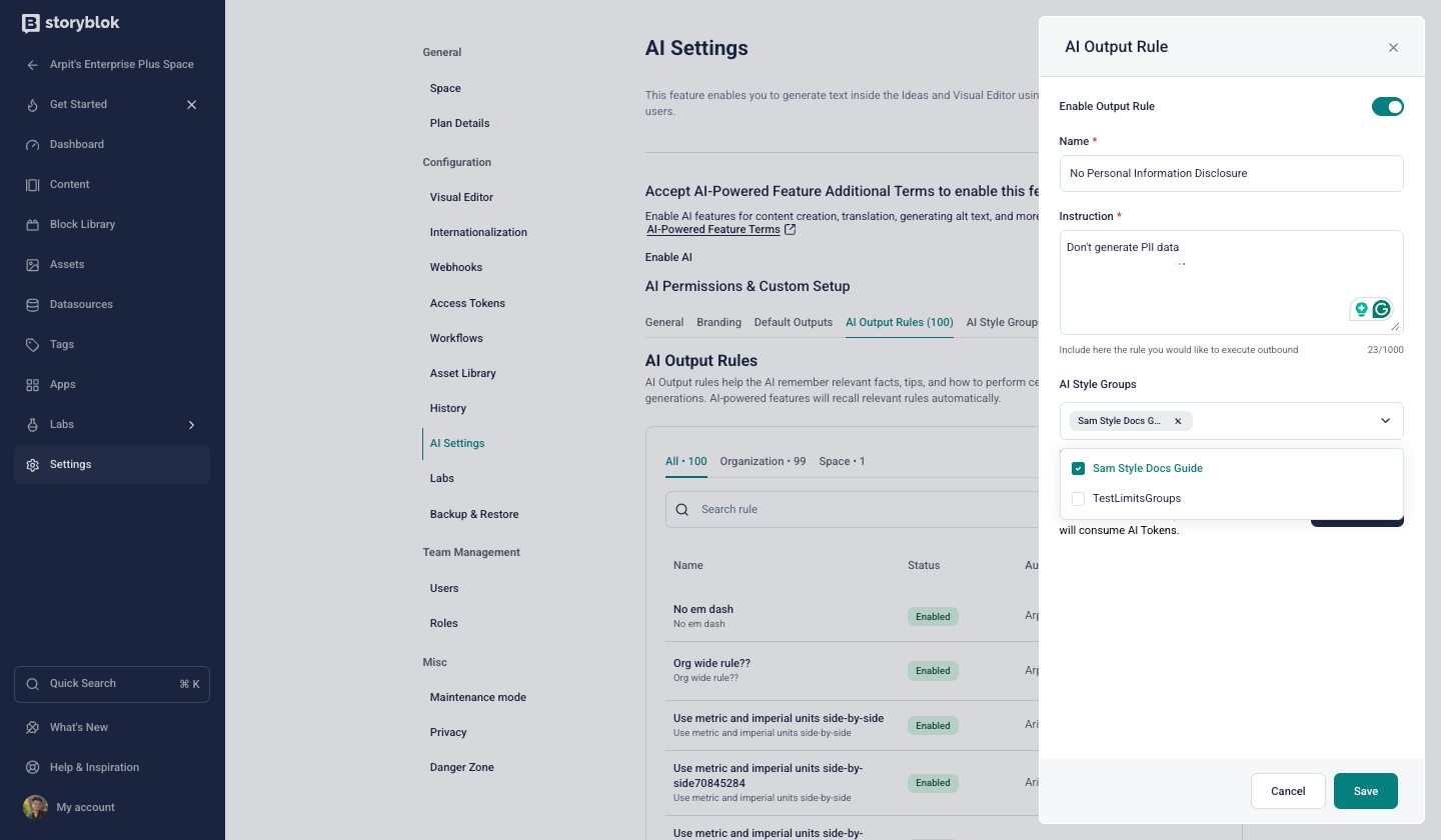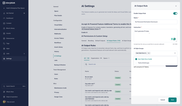 To create a new rule in a space, go to AI Settings > AI Permissions and Custom Setup > AI Style Groups and click Add new style group and select output rules for the group.