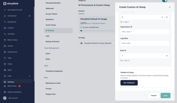 Adjust AI behavior by adjusting generation settings like temperature, top-p, and stop sequences to control how the AI responds. Click Run Validation to test the connection, then click Save.