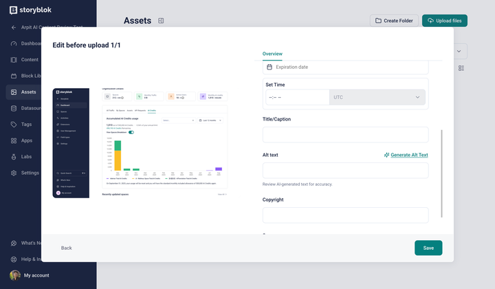 Section titled “AI Alt Text”AI Alt Text generates accessibility text for images in the Storyblok asset manager. To generate alt text, click Generate Alt Text in the asset uploader.