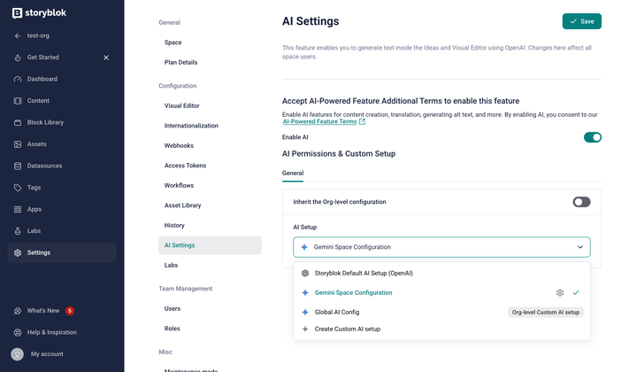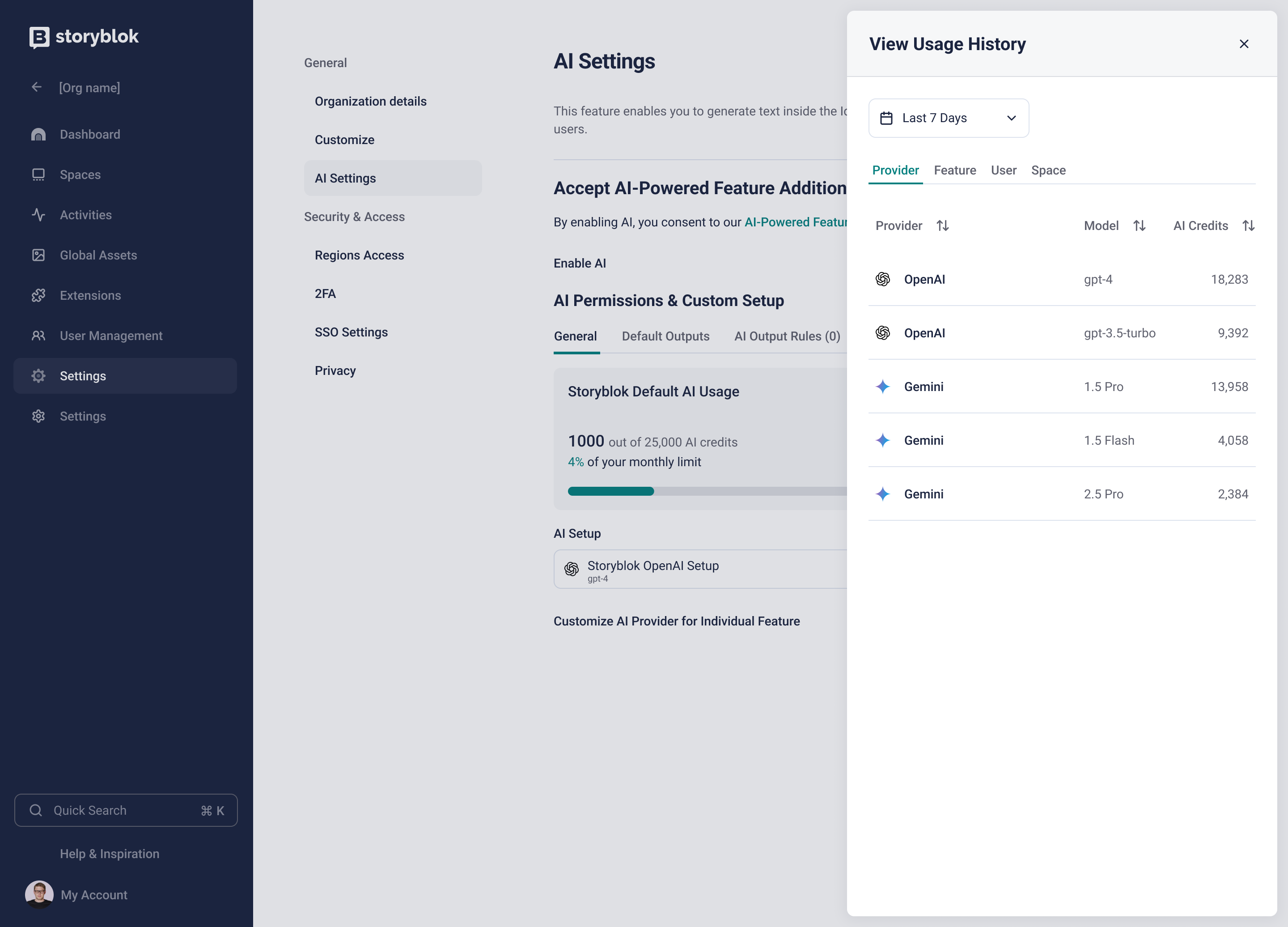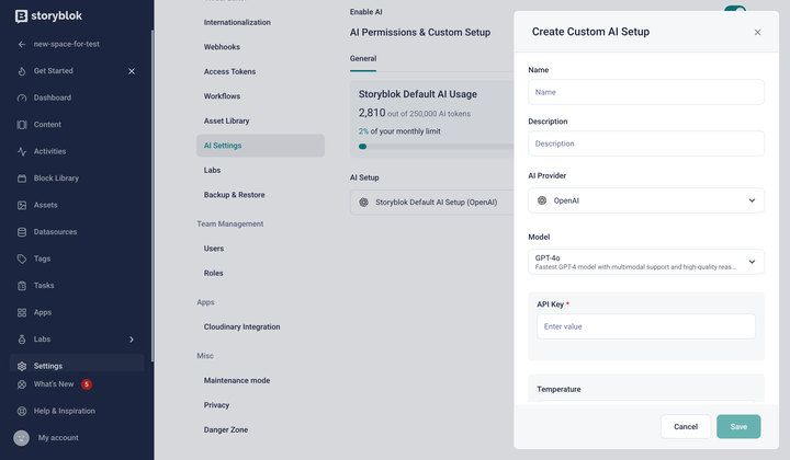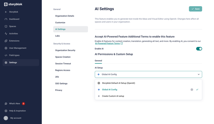 Storyblok's AI features assist with content creation and management needs, including translations, alt text, and SEO. Admins can enable AI features at either the space level or the organization level by going to Settings > AI Settings.