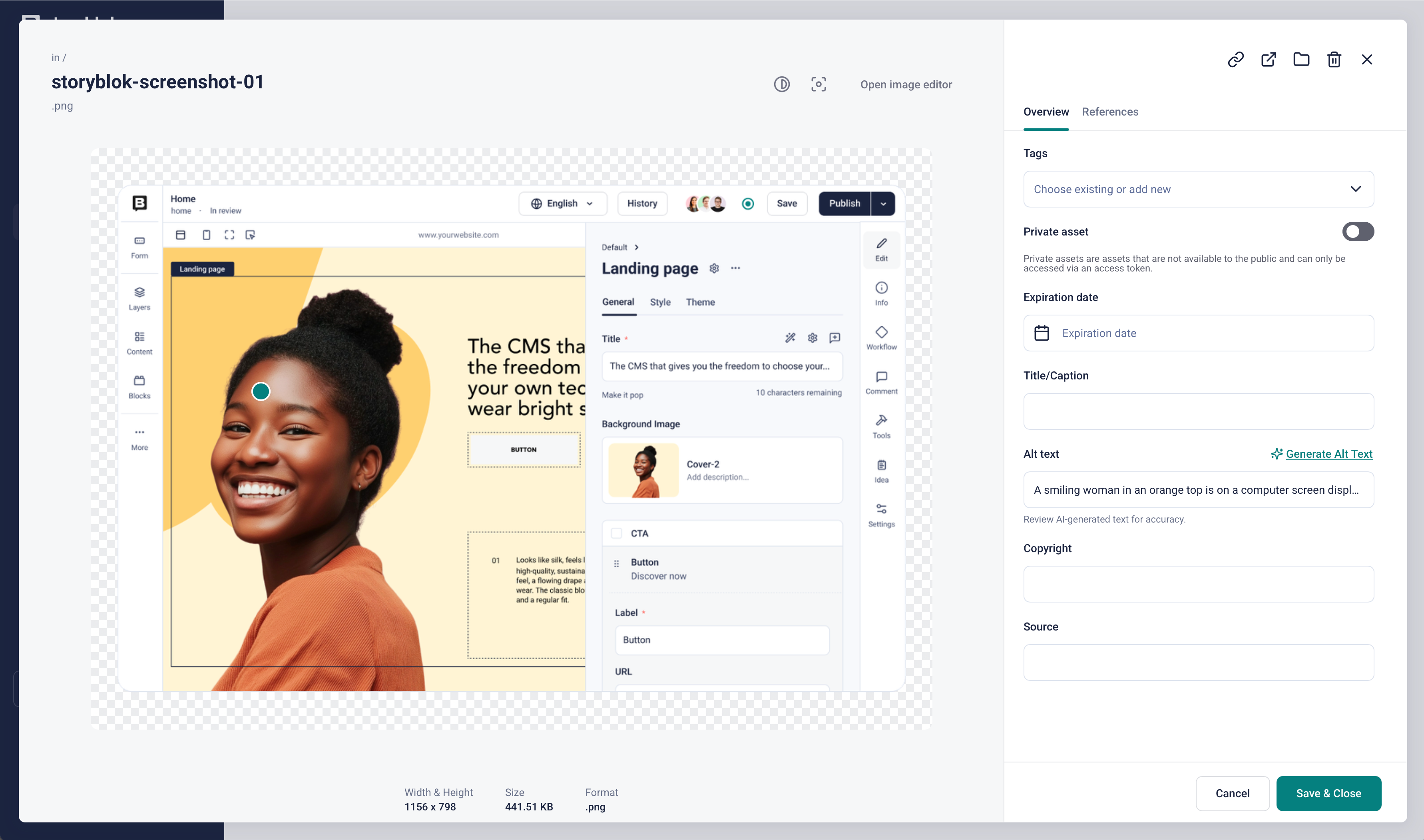 If AI alt text is enabled in your space (under Settings > AI Settings), the Generate Alt Text button will produce alt text for PNG, JPEG, and WEBP images. Always verify AI-generated text.