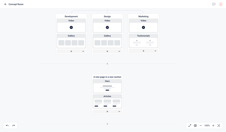 A concept is an internal document where your team can collaboratively conceptualize sections, pages, and components and seamlessly involve designers and developers in the process. Efficiently plan your project's content architecture using the Concept Room.