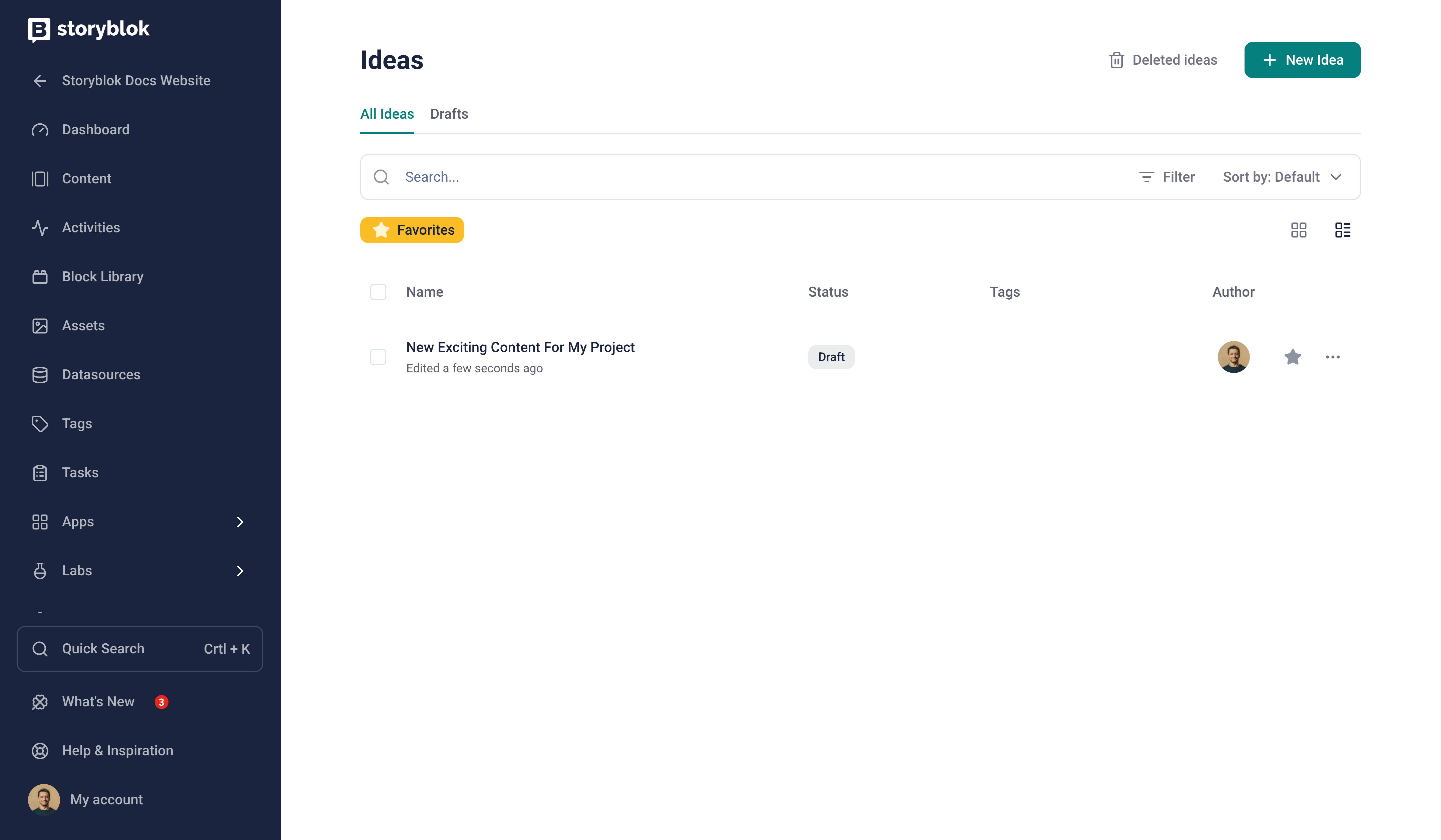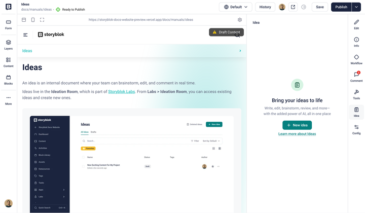 Ideas live in the Ideation Room, which is part of Storyblok Labs. From Labs > Ideation Room, you can access existing ideas and create new ones.