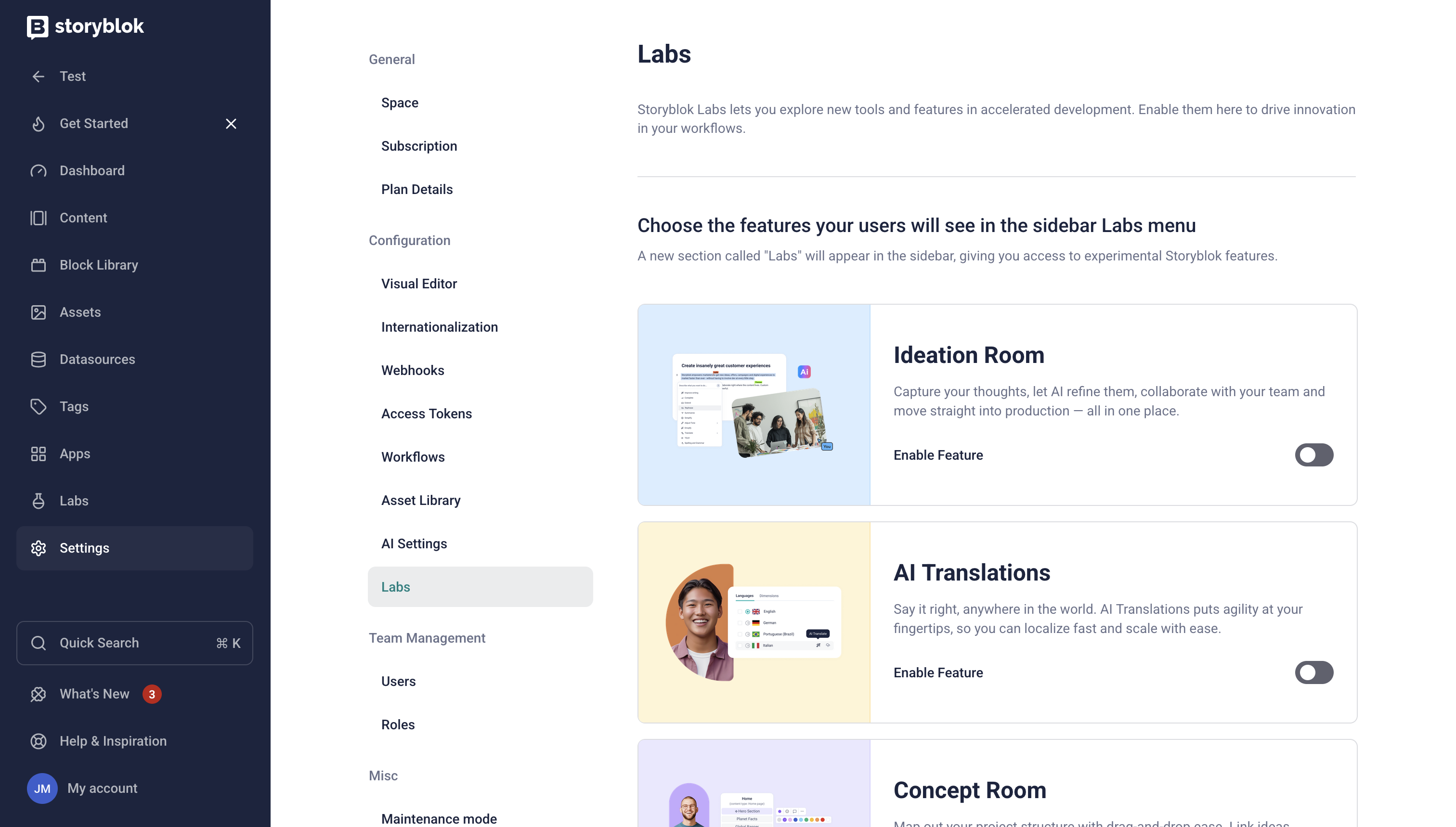 Labs is a dedicated hub for new, innovative features available within Storyblok. Expand your editorial process without leaving Storyblok.