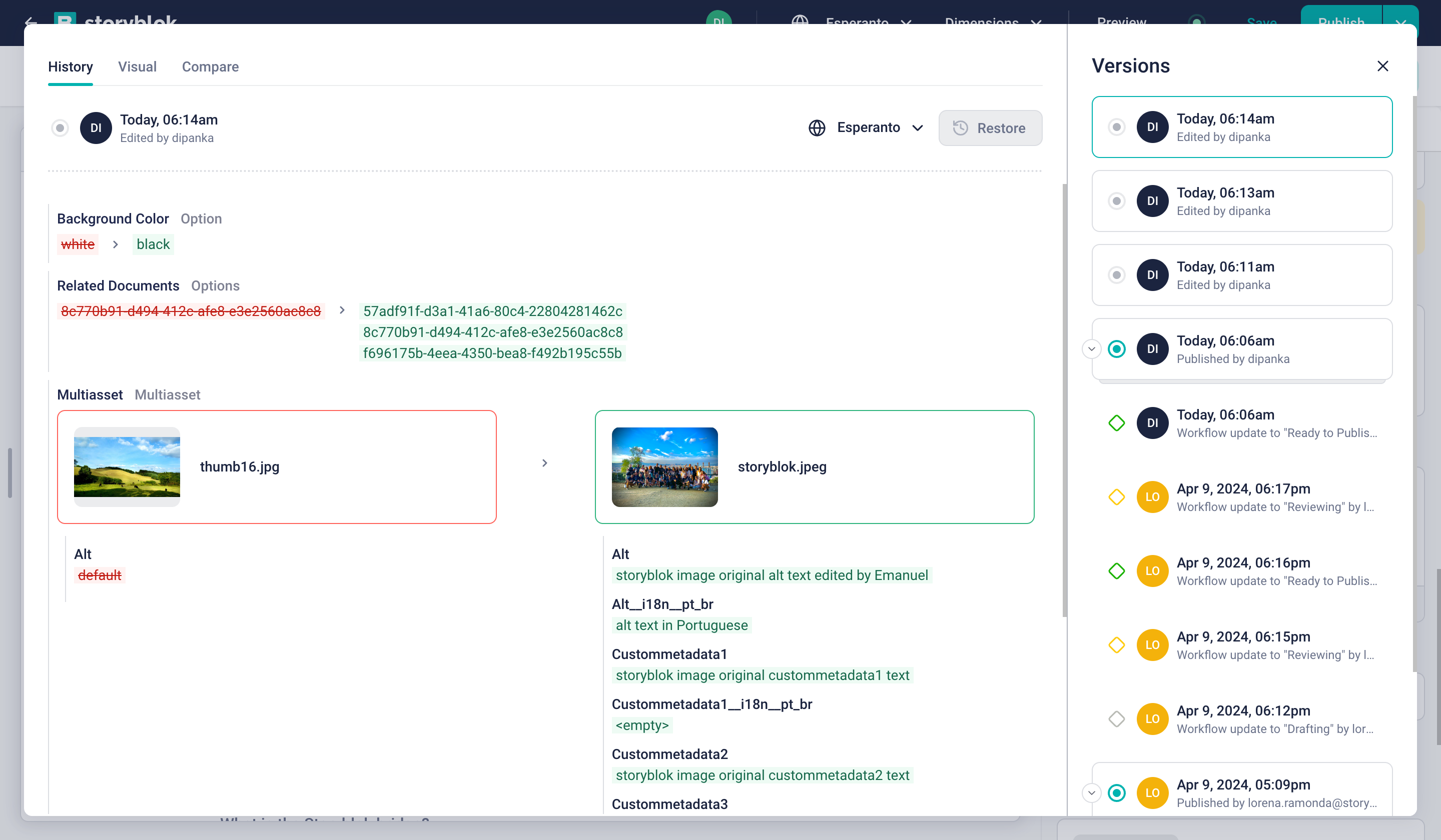 Choose a CMS that makes this tracing process easy. One intuitive option is to go visual. With Storyblok’s Comparison View feature, you can compare color-coded saved drafts with published versions, connected directly to the user who made the changes with a time stamp.