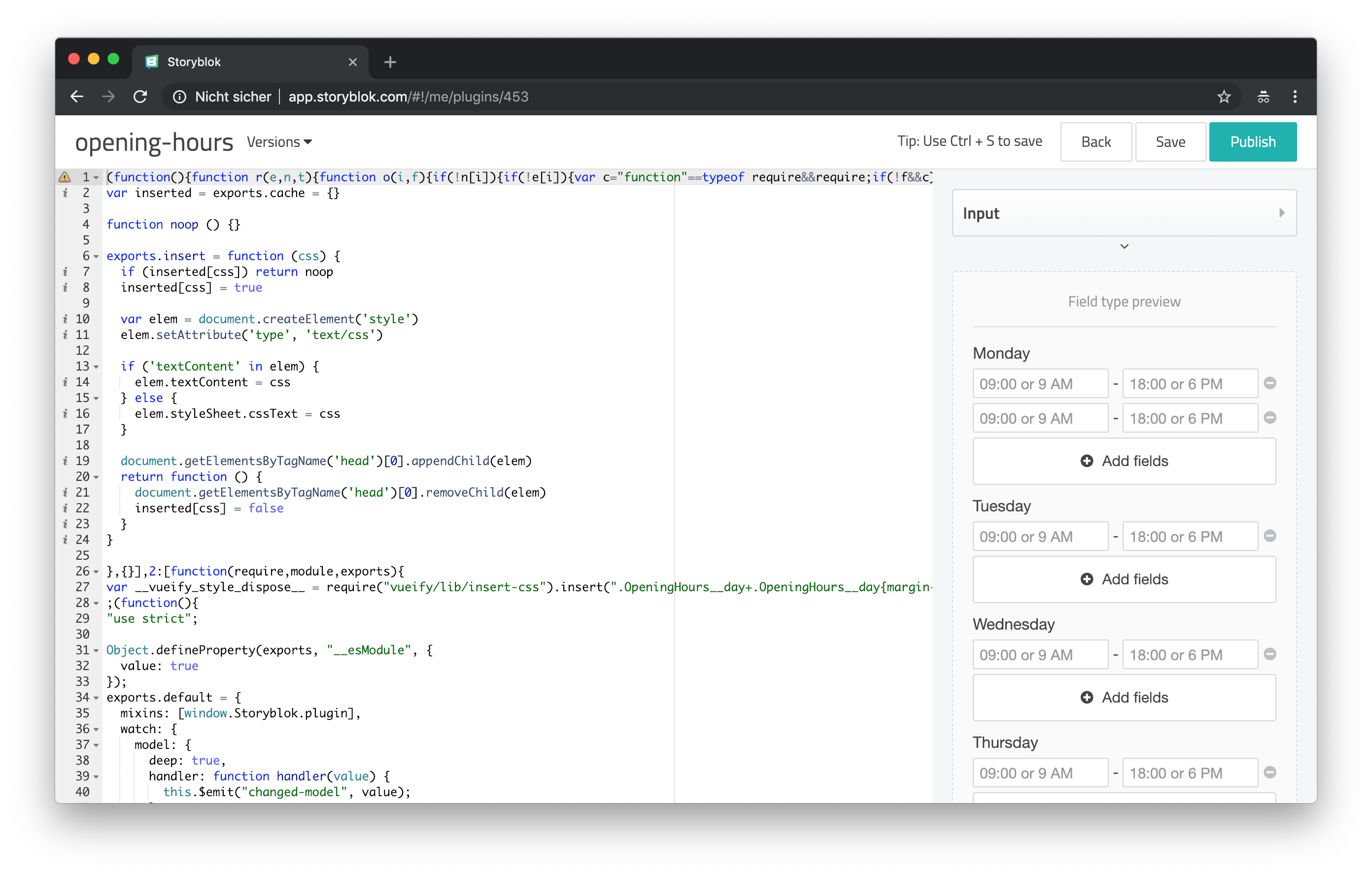 Now that our opening hours plugin is ready, we can build the plugin by running npm run build. Afterwards we have to copy and paste the generated code from dist/export.js into the editor text field of the Storyblok app and click the publish button.