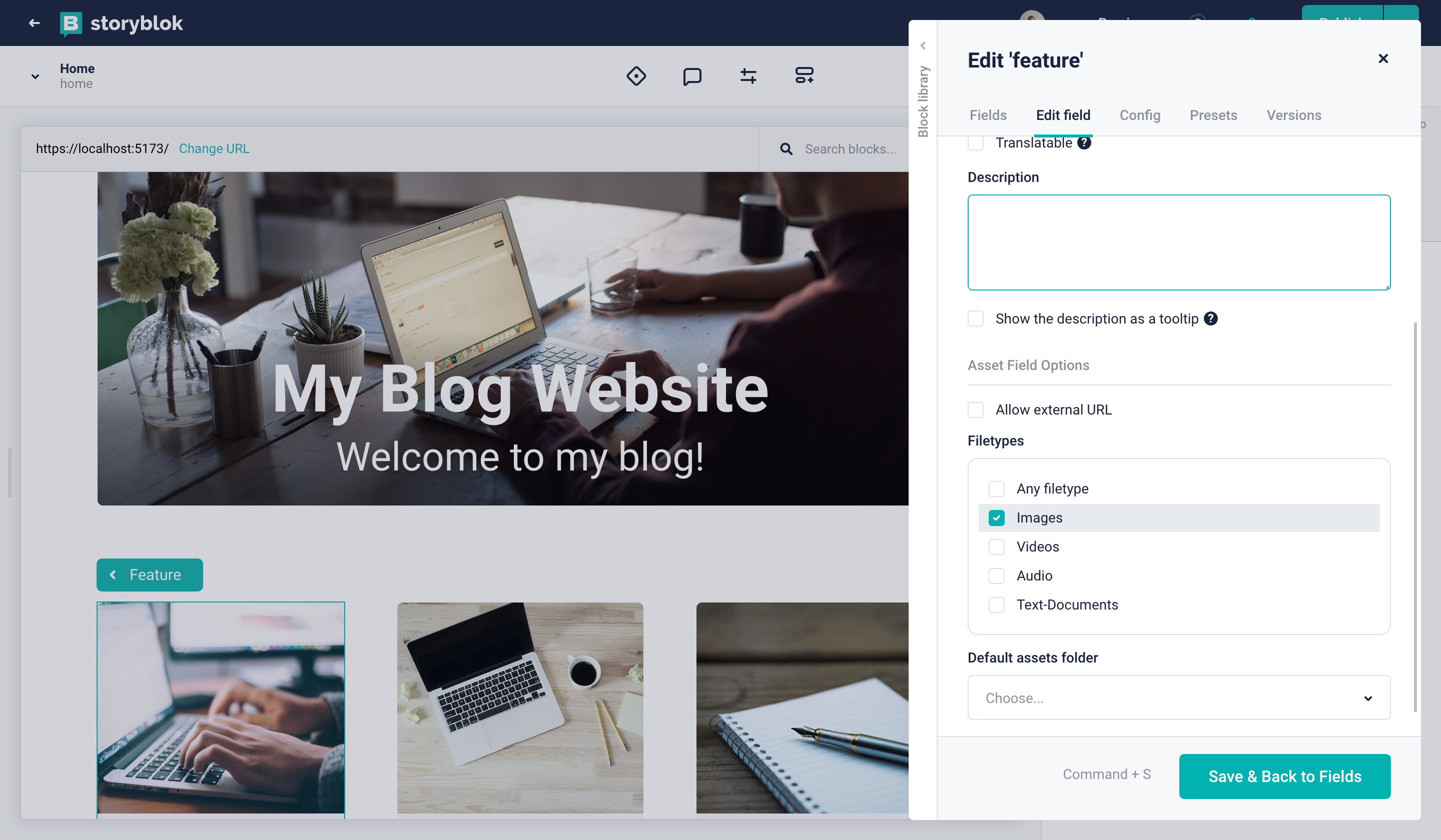 And that’s that! After closing the Block Library, you’ll see the image field, allowing you to upload an asset. Go ahead and upload some images for the three instances of the Feature component. Of course, they won’t show up in your Laravel front end just yet, so let’s take care of that next.