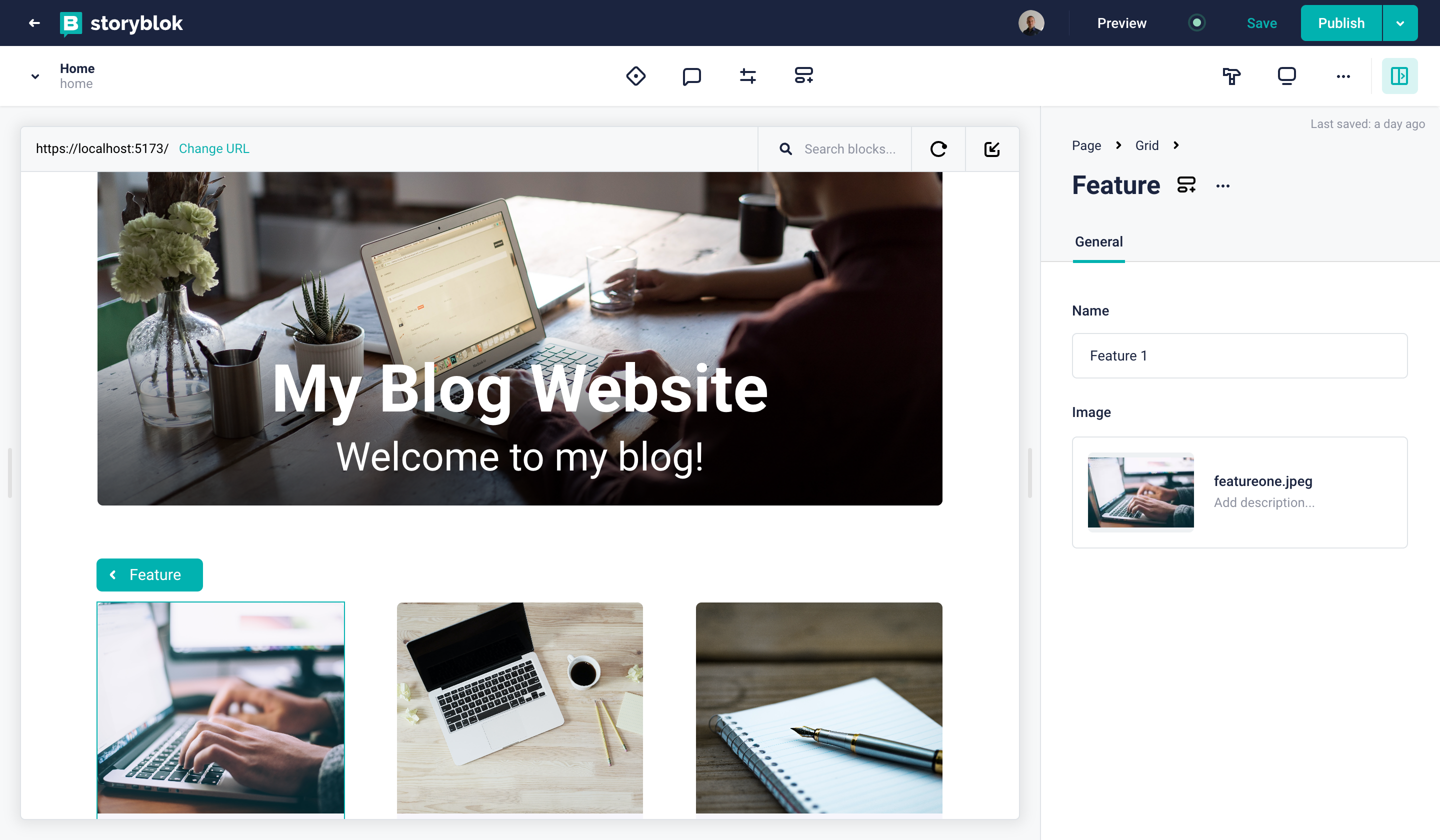 To modify it right from the Visual Editor, go to the Home story and click on one of the Feature components, which exist as nested blocks in the Grid component. To edit the schema, click on the component icon next to the name {1}.