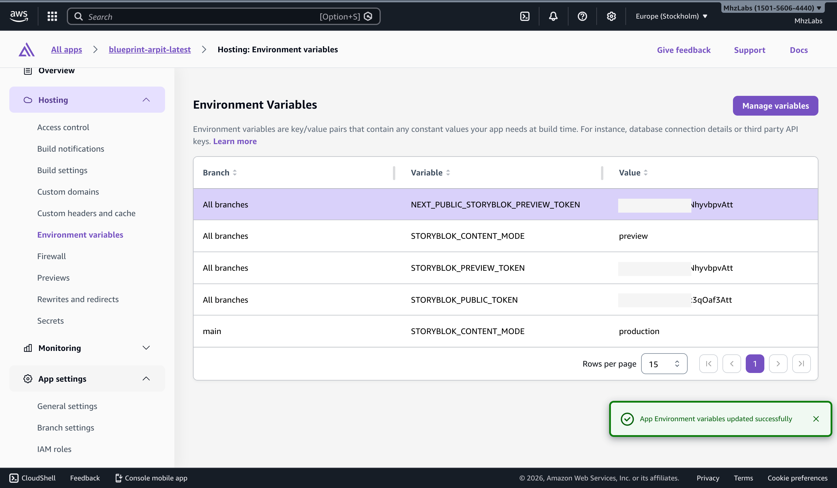 Let us now configure our Storyblok access tokens as environment variables on Amplify. We will need to configure two different types of tokens here. A public token, which allows access to published content, and a preview token, which allows access to content that is unpublished. Read more in the tokens concept.