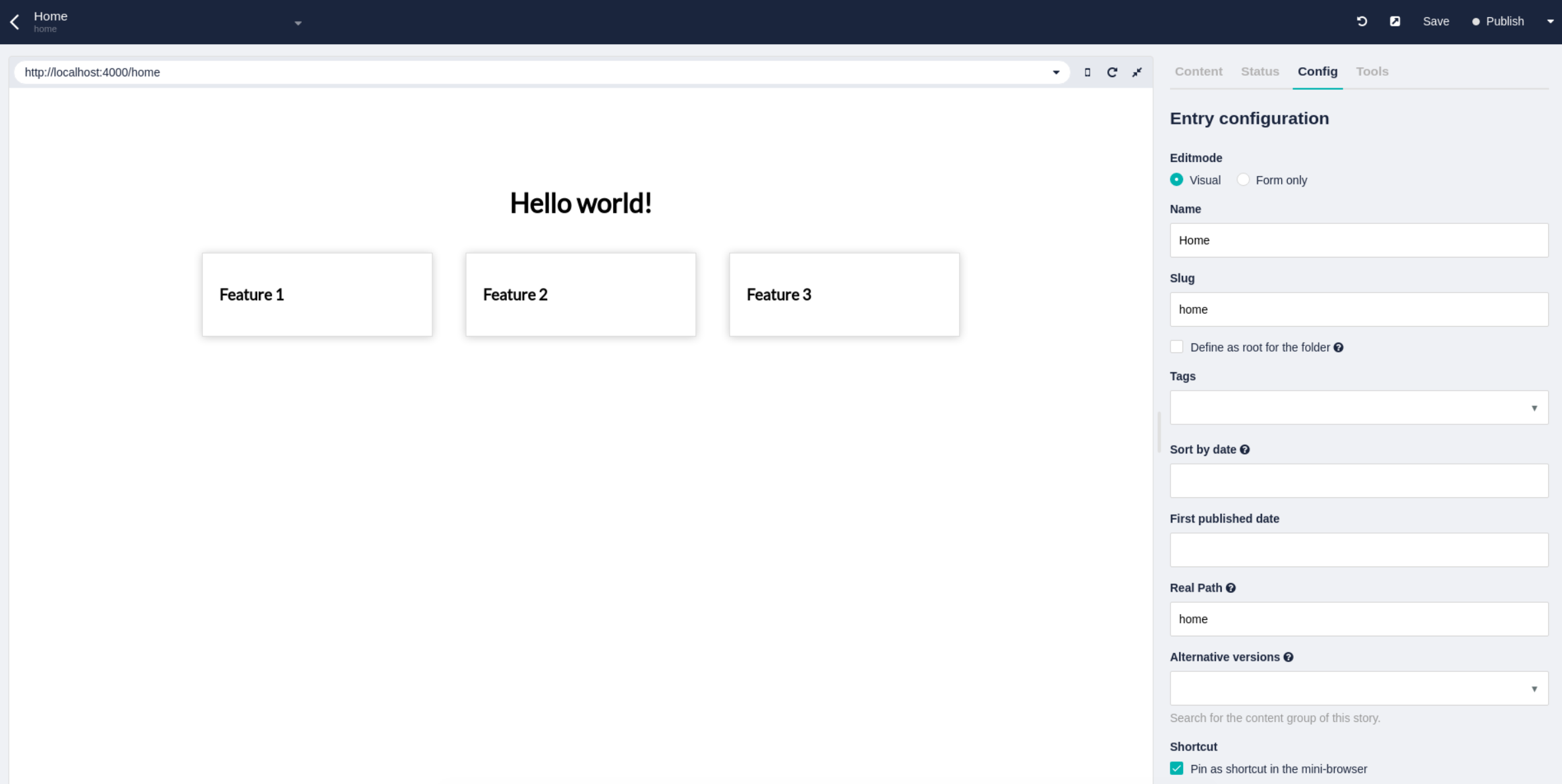 During this article, we will use the default component page which acts as layout/content-type and the nested components teaser, grid and feature to create a sample layout for landing pages. You will receive this setup during this tutorial, however, if you've already created a space that structure is already available in the content entry with the name "home".