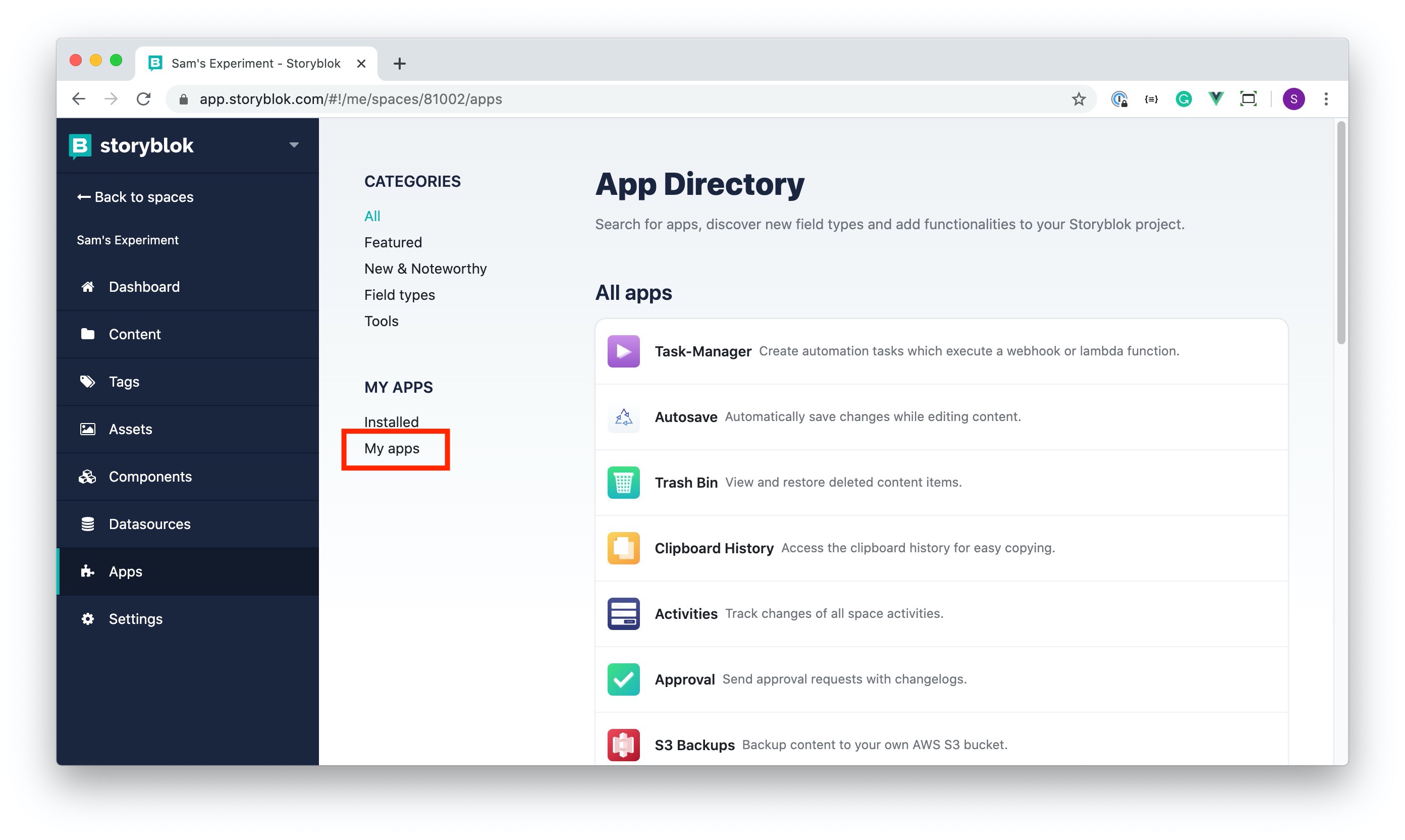 You can install your app like any other app in one of your spaces in Storyblok. Open the App Directory in your space and change the filter to show your custom apps. Open the details of your app and hit the install button.
