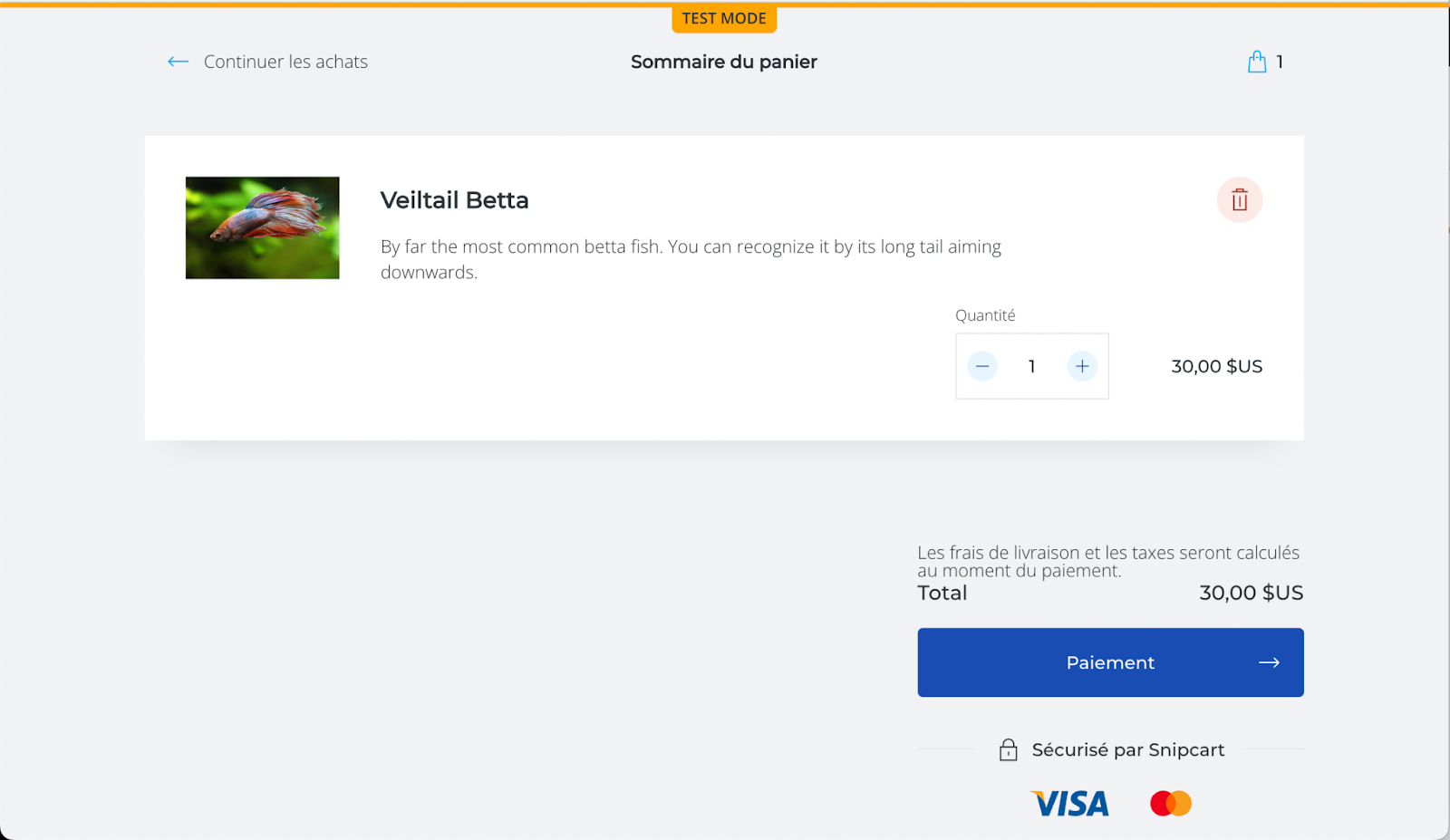 Then you can click on Checkout, but to put it in production you need to put a payment gateway in your Snipcart account and everything should work without doing anything.